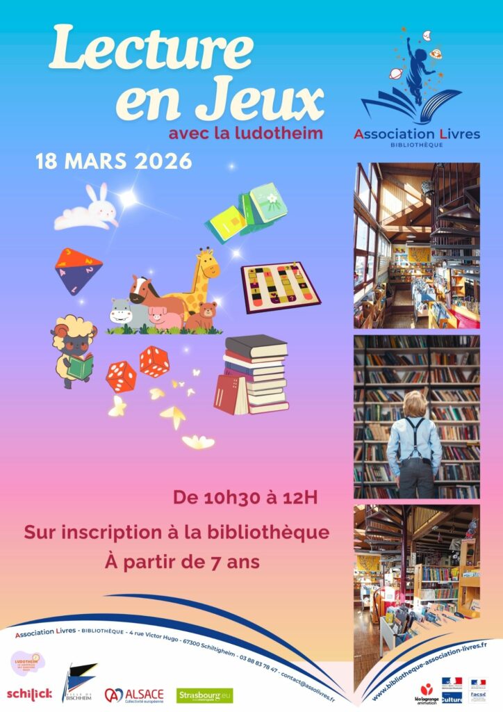 L’ASSOCIATION-LIVRES accueille petits et grands au sein du quartier des Ecrivains de Bischheim et Schiltigheim. Riche de plus de 14 000 documents renouvelés régulièrement, vous trouverez votre bonheur parmi les nombreux ouvrages proposés des premiers albums, premières lectures, romans jeunesses, mangas, bandes dessinées, livres documentaires aux magazines.